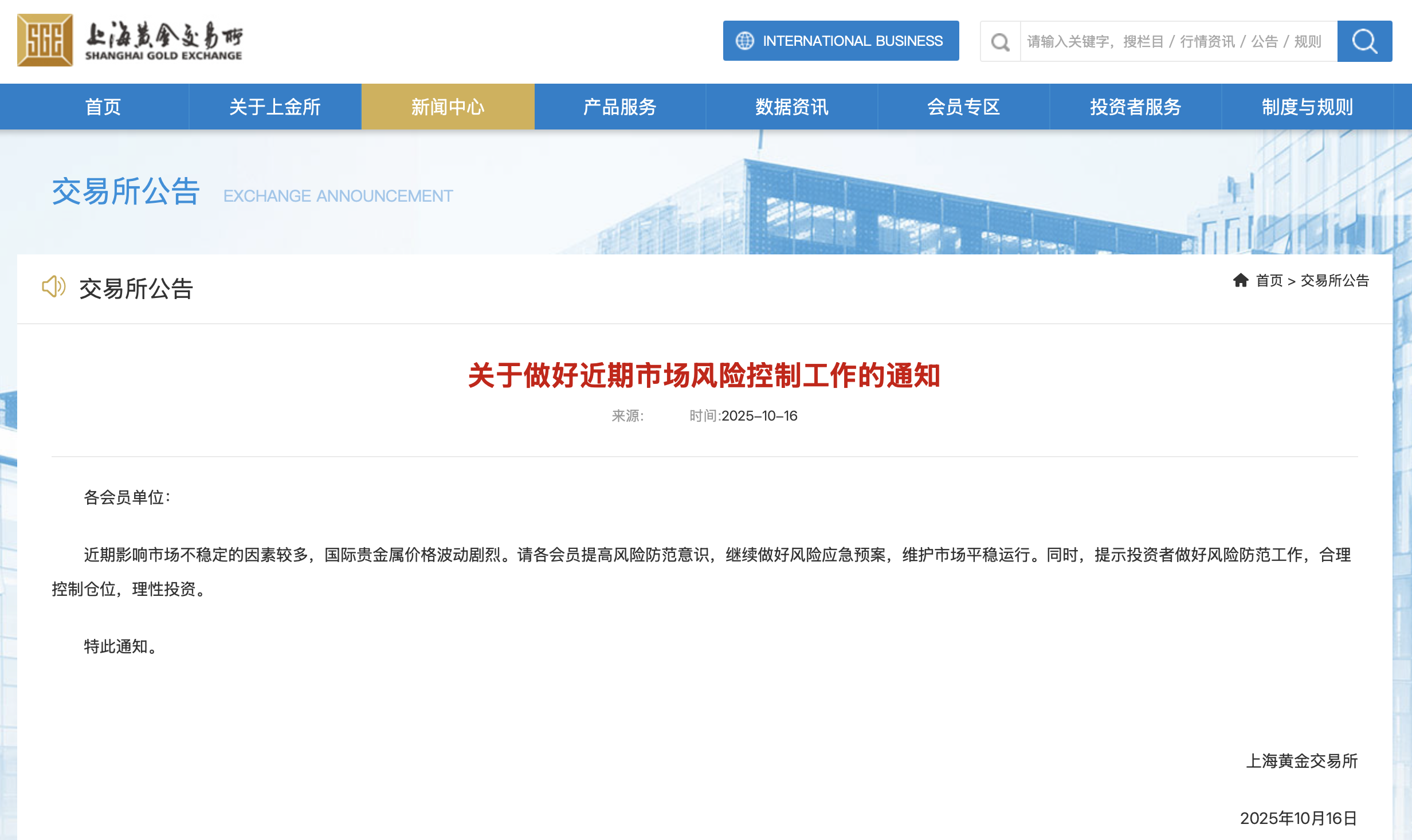10月16日开yun体育网,上海黄金来回所向各会员单元发布一则《对于作念好近期阛阓风险截止使命的奉告》: